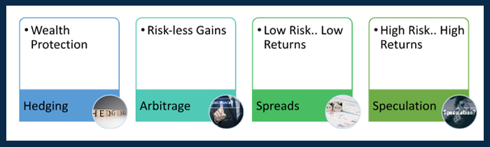 Hedging, Arbitrage, Spreads, and Speculation are the strategies associated with Derivatives. Each of these strategies are an ocean of information in itself and requires a careful guidance under an expert.